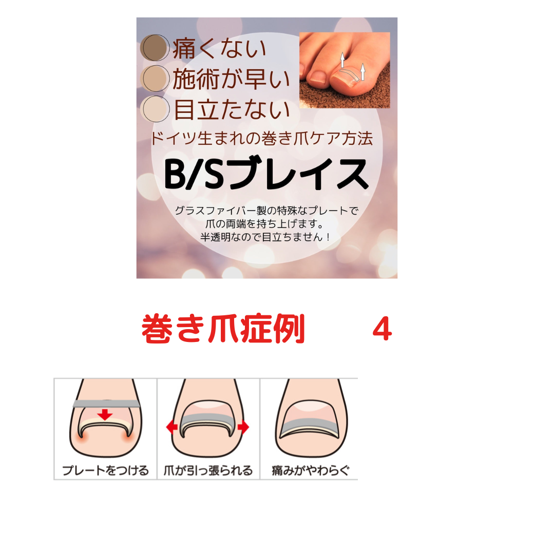 当院では、B.Sブレイス(巻き爪補正器具)を用いた非侵襲的な施術を開始。 爪の状態に合わせて矯正を行います。